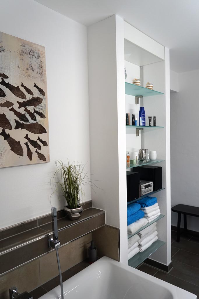 Vierseitig ausgebautes Wäschezimmer mit Drehtüren und Schubkästen; Ankleideraum mit viel Stauraum und Ablageflächen; selbstgefertigte Einbauschränke, der Dachneigung angepasst