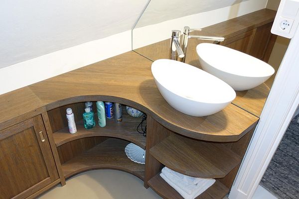 Eiche-Badezimmermöbel, zierlich unter der Dachschräge eingepasst, mit Ausschweifungen passend zum Waschbecken
