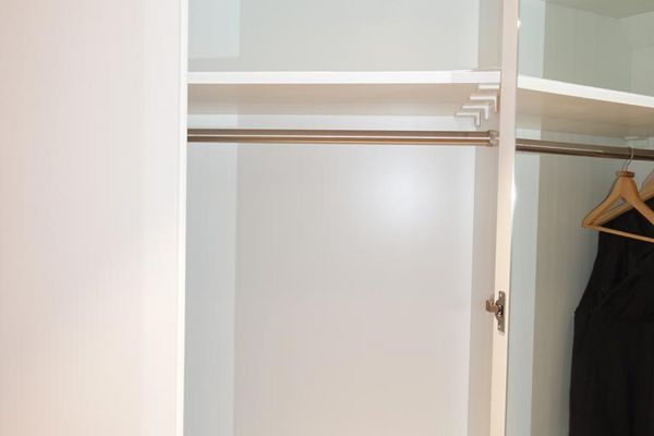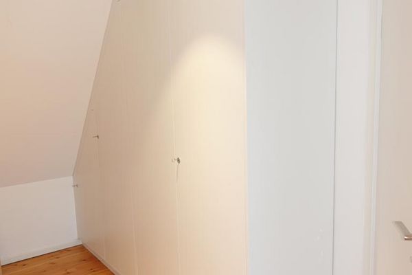 Einbaumöbel, an die Dachschräge angepasst, als Kleiderschrank mit in mehreren Arbeitsgängen aufgetragenen Lackschichten - passend zur Inneneinrichtung.