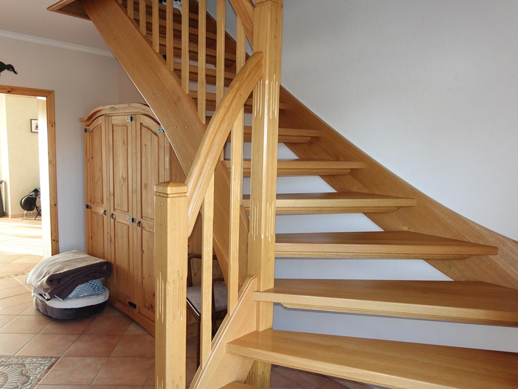 Offene, eingestemmte, viertelgewendete Eichen-Geschosstreppe mit profilierten Pfosten und Geländerstreben, mit optisch angeglichener Kindersicherungspforte und Rücklaufgeländer
