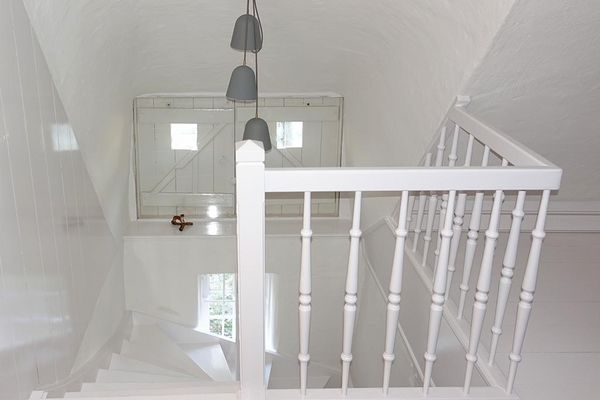 Unauffällige Treppe in weiß mit Tritt- und Setzstufen in Eiche - gekalkt, passend mit Eiche-Landhausdiele